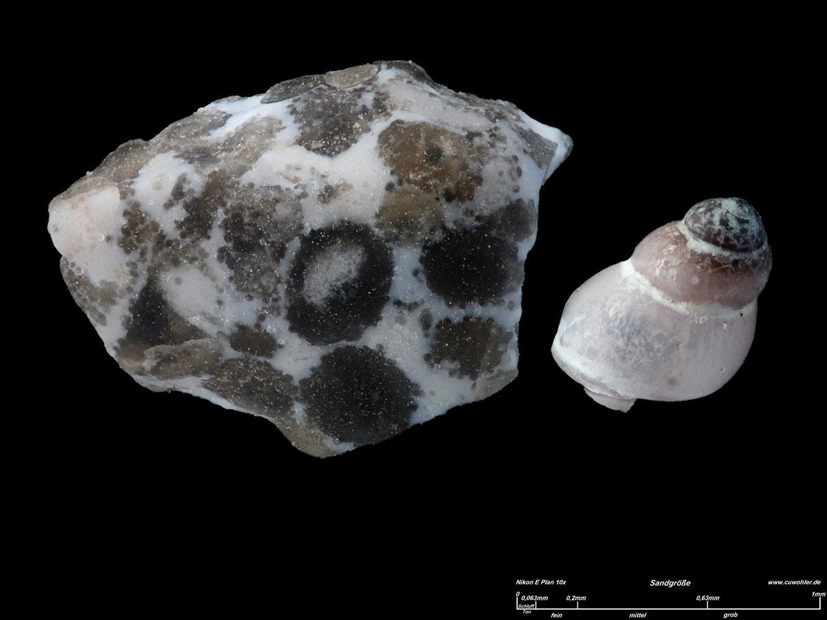 Sandkorn mit interessanter Maserung und Schnecke aus dieser Probe