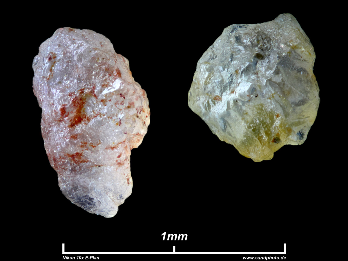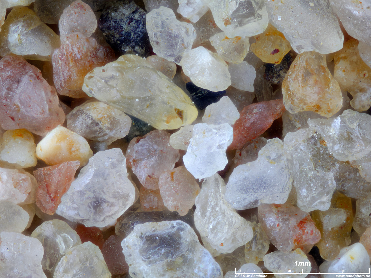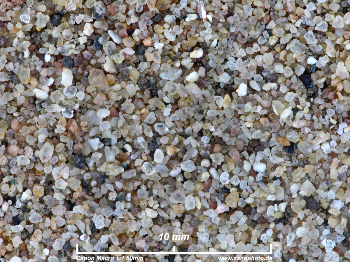 Quarzsand mittlerer Körnung, viele gelb und rosa eingefärbte Körner, magnetischer Anteil