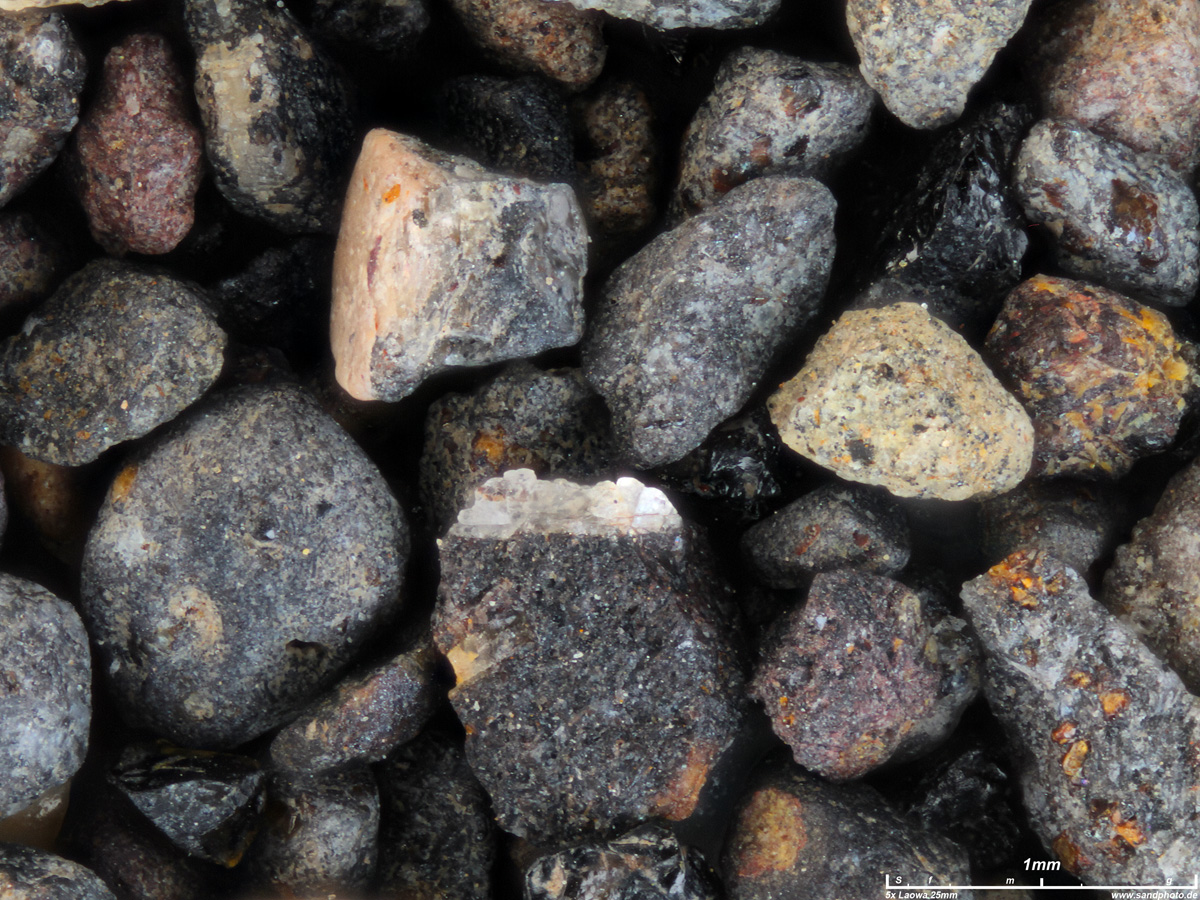 Magnetitsand mittlerer bis grober Körnung, Sandhügel rechts hinter der Strandmauer