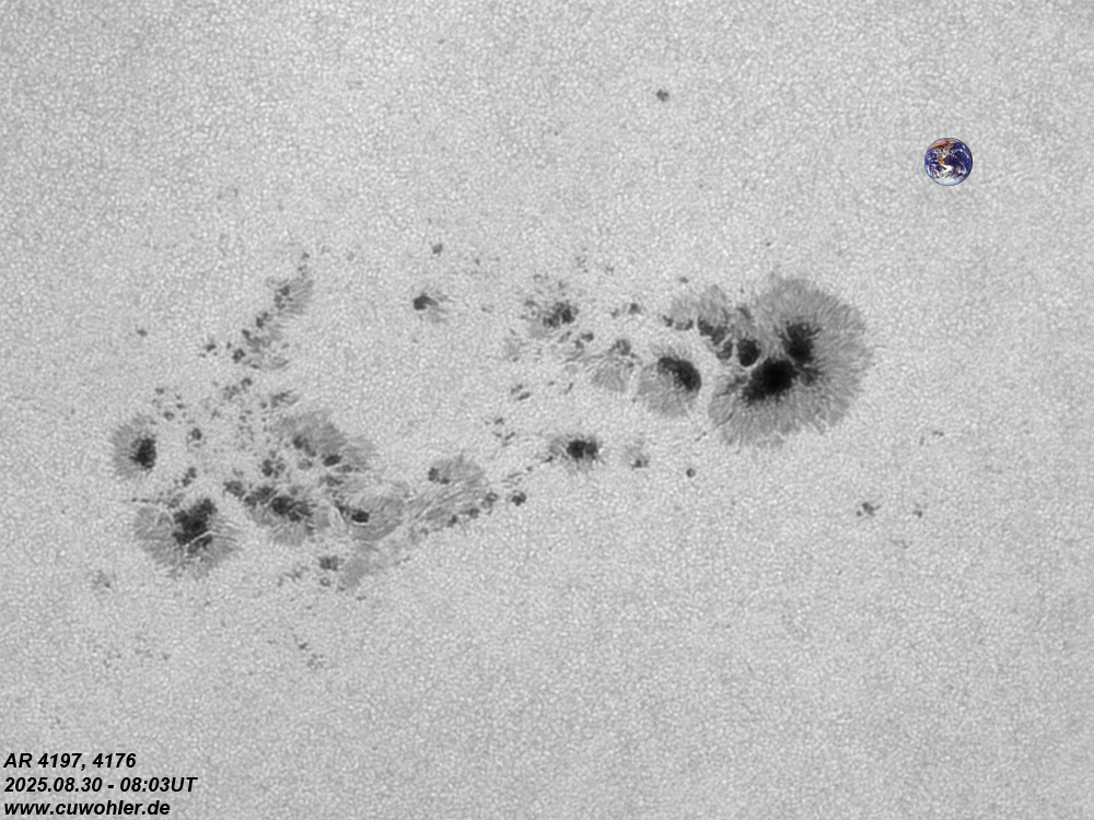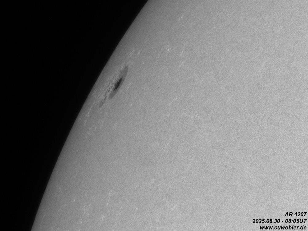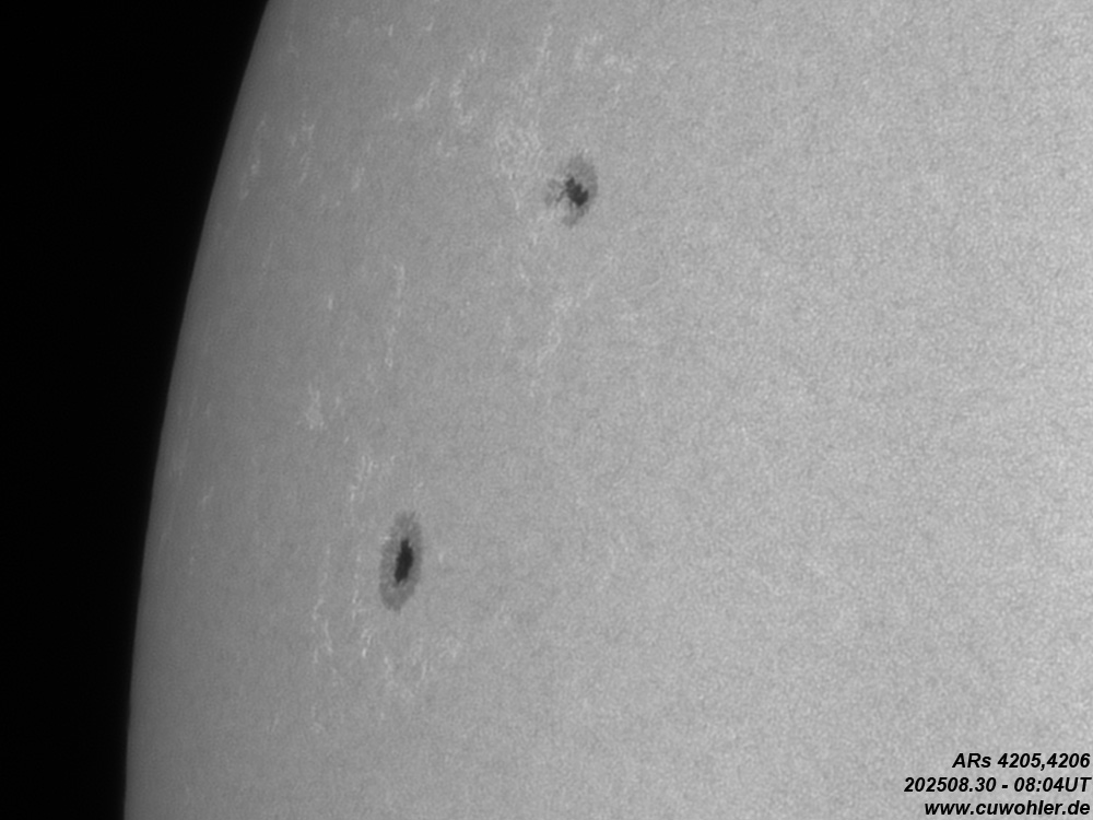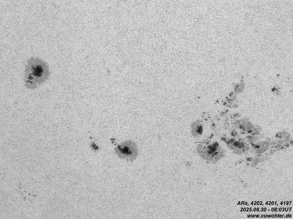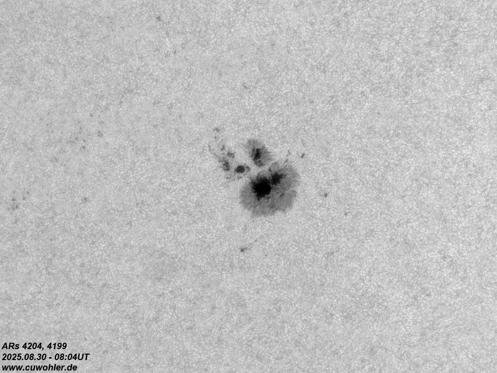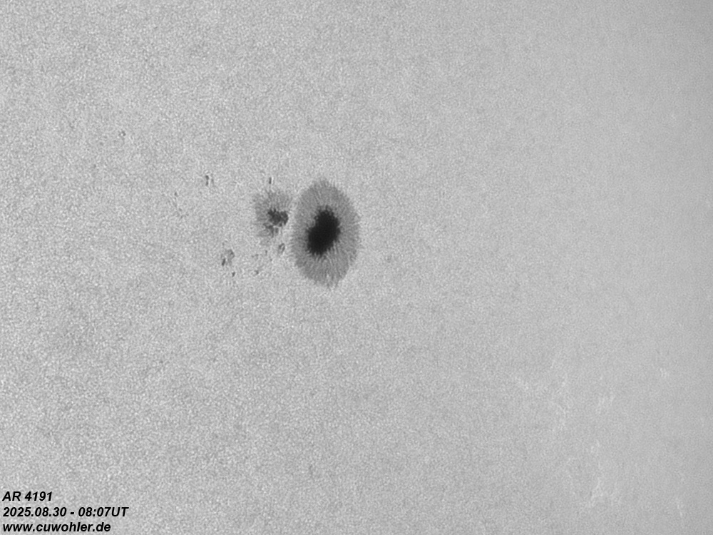 Aufgenommen mit TS SD 102/714, Herschelprisma, (Antlia CaK Filter,) Solar Continuum Filter, (Barlow 2,25x) und ASI 290 MM