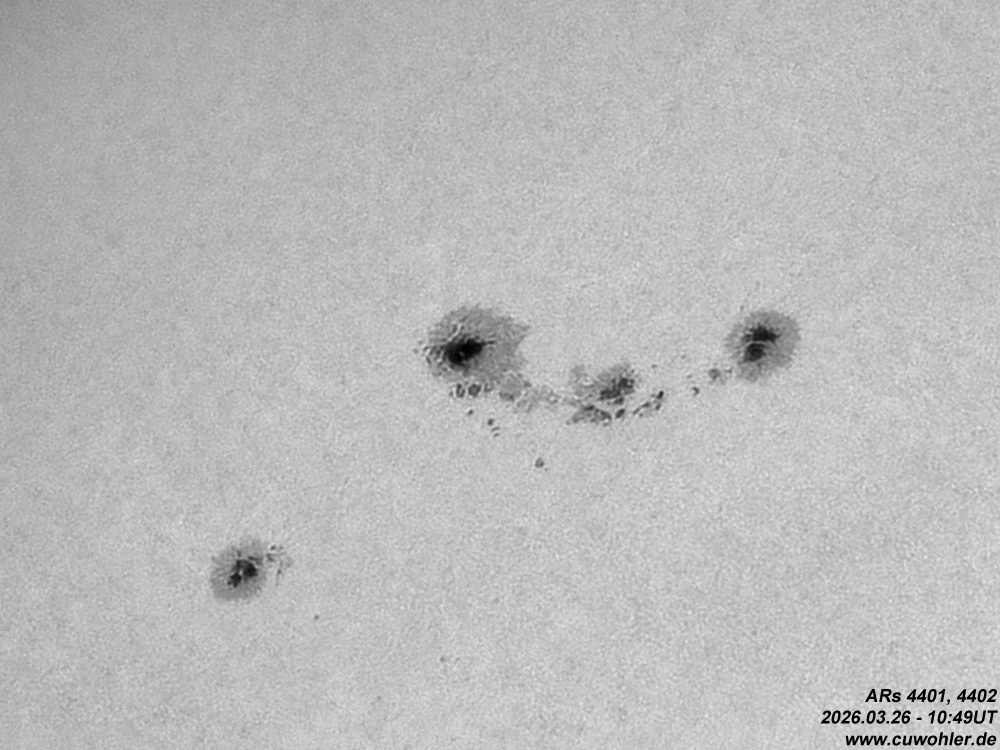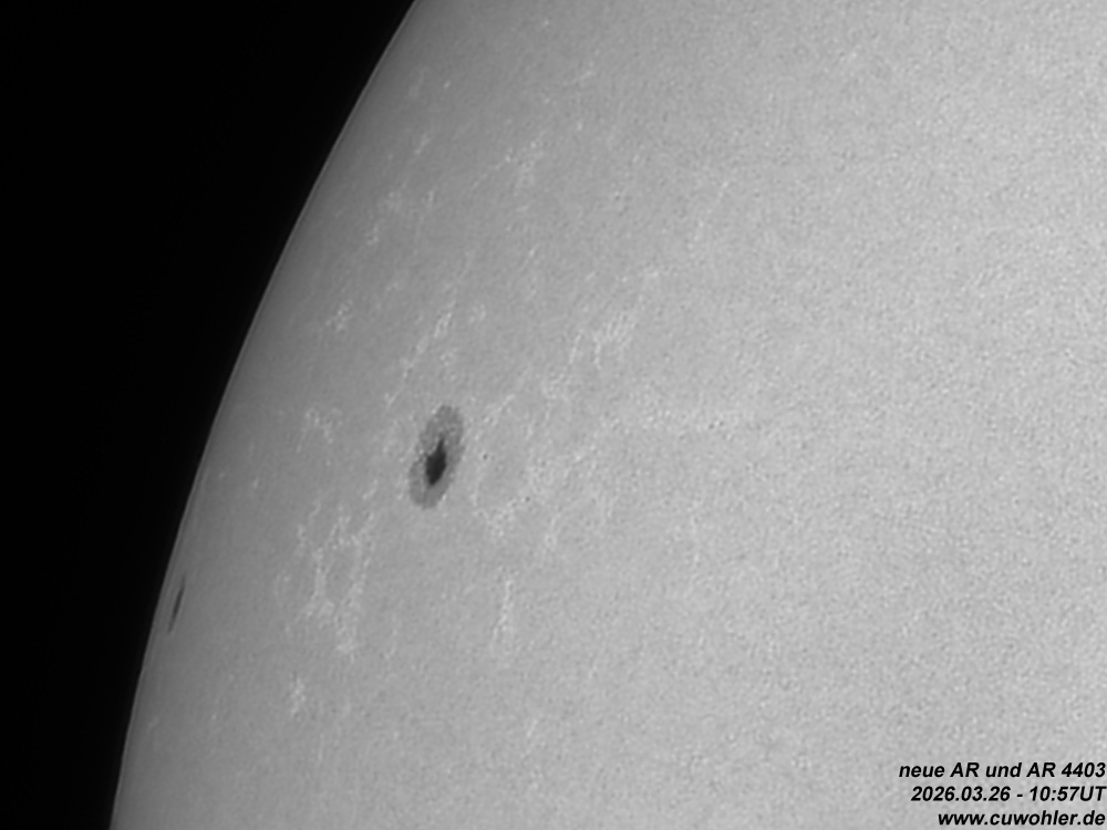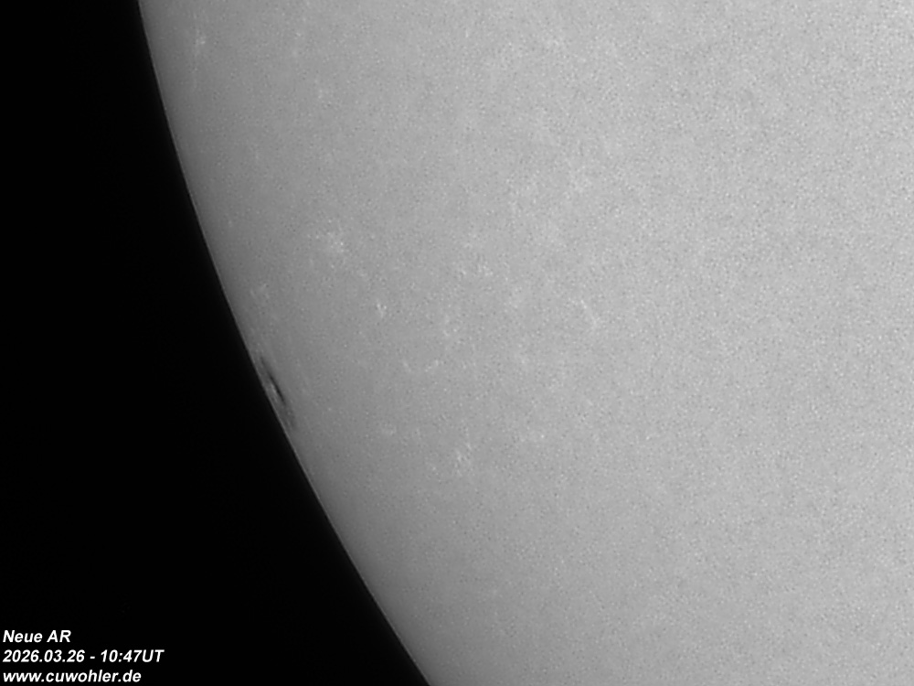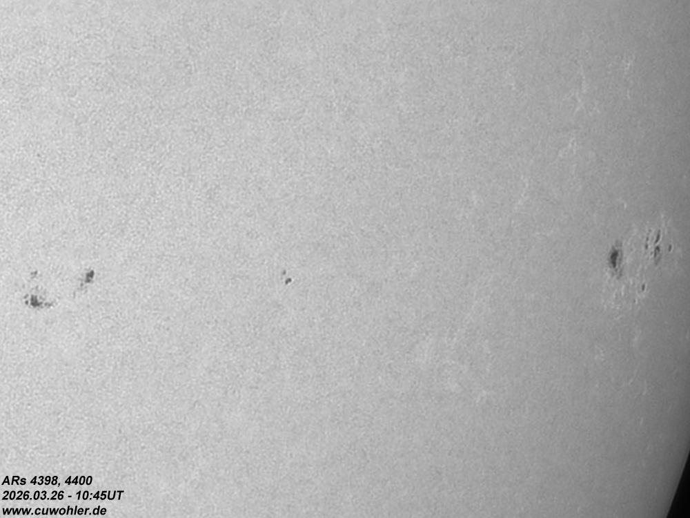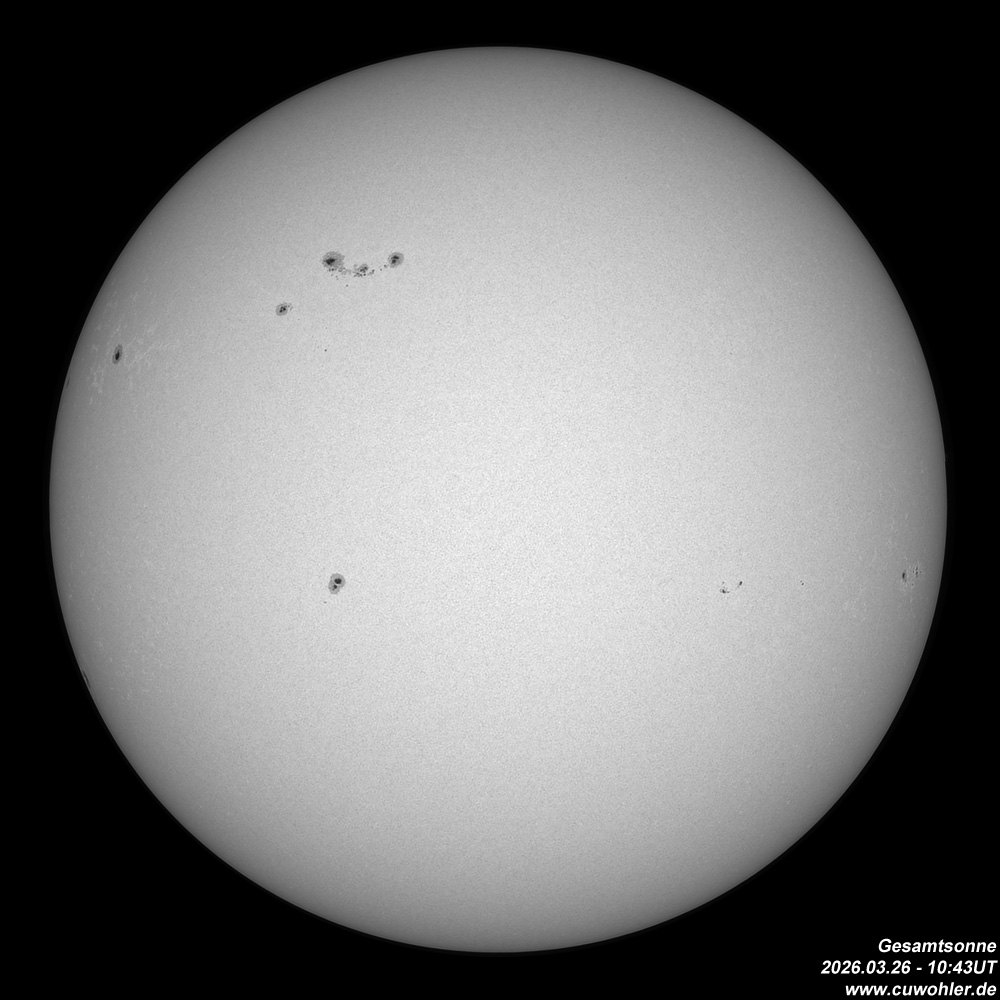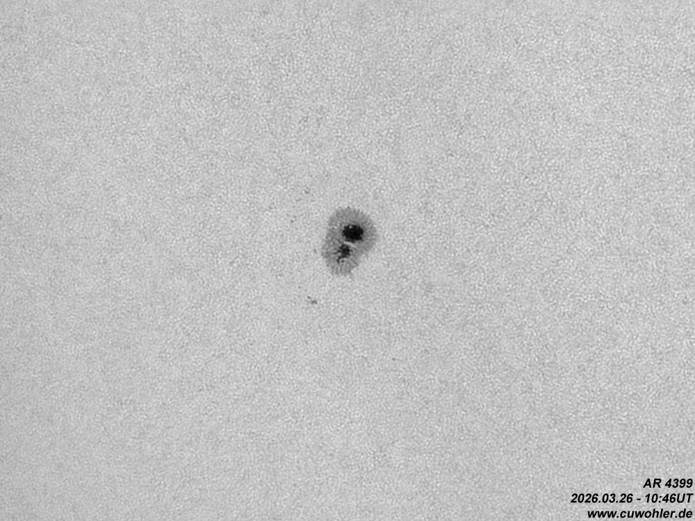 Aufgenommen mit TS SD 80/560, Baader Solar Continuum Filter, Herschelkeil, (Baader Q-Turret Barlow 2,25x), Baader UV-, IR Cut Filter und ASI 290 MM.