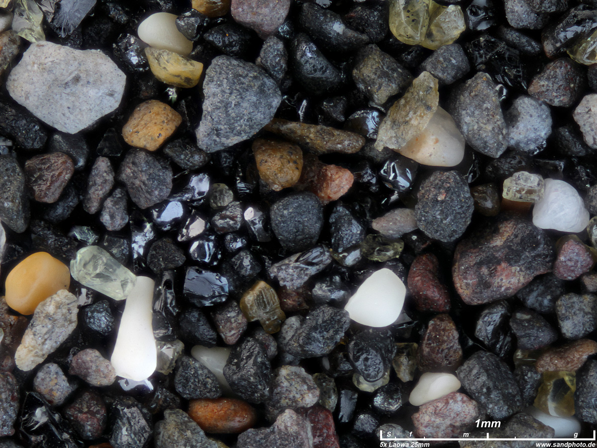 Obsidian, Einzelstück und in Sandkorn gebettet sowie Foraminifere aus dieser Probe
