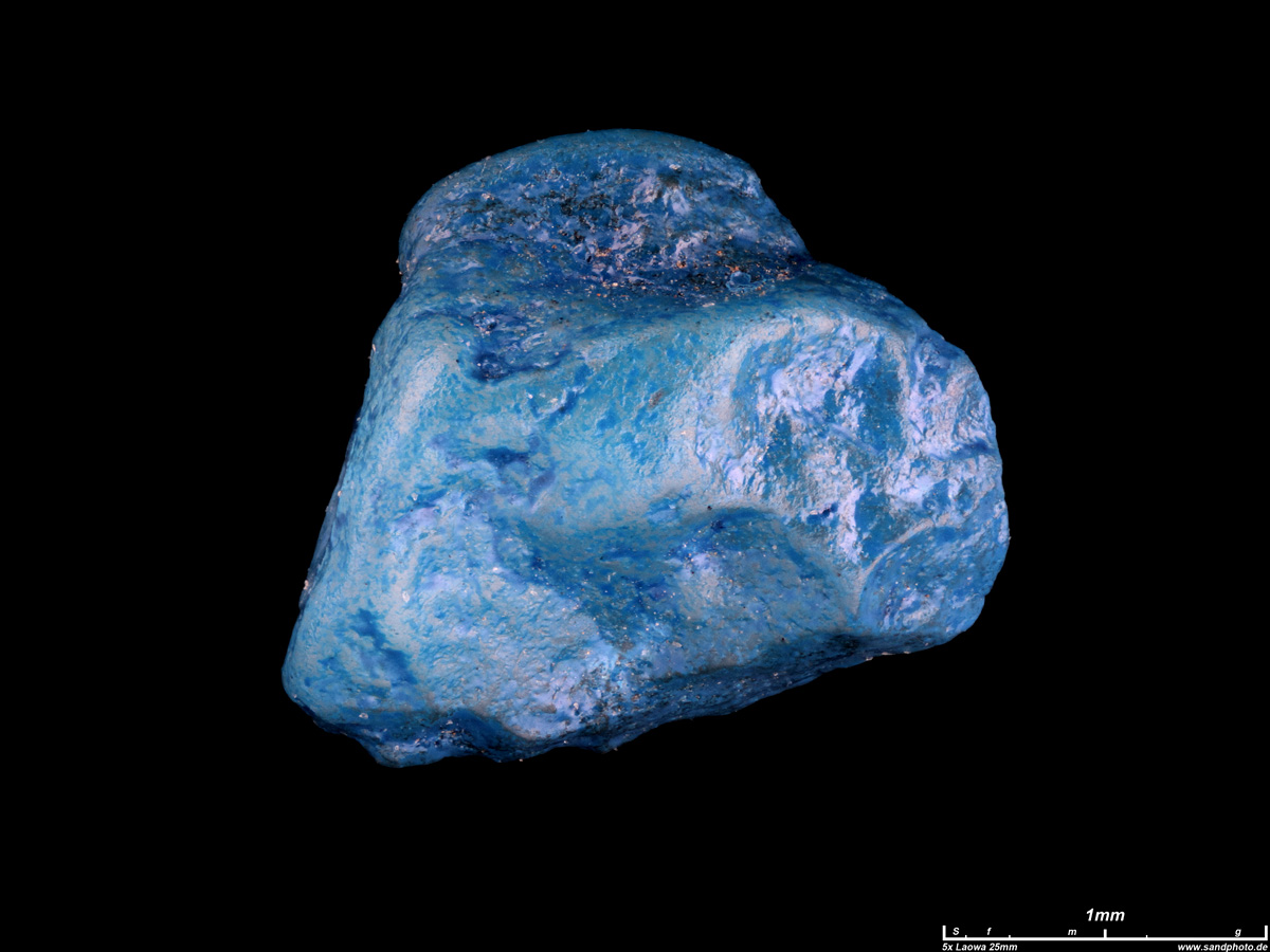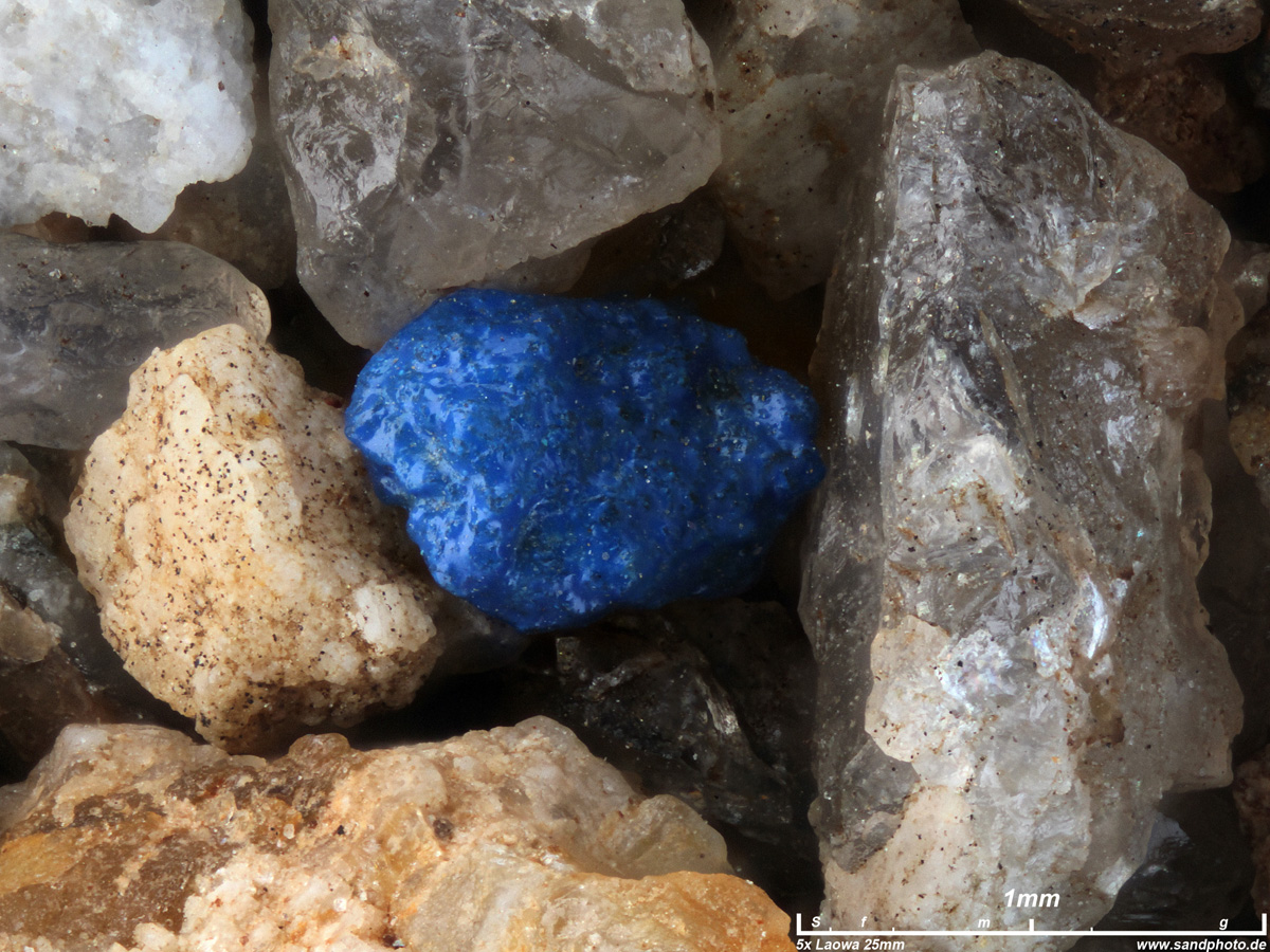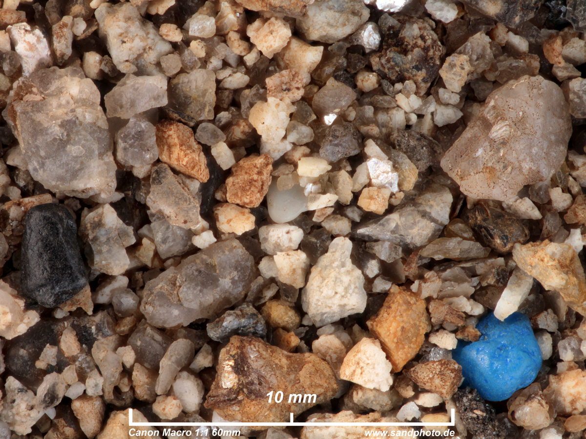 mineralischer Sand mittlerer bis grober Körnung mit blauen Körnern (Kupfersulfat? Kunststoff?)